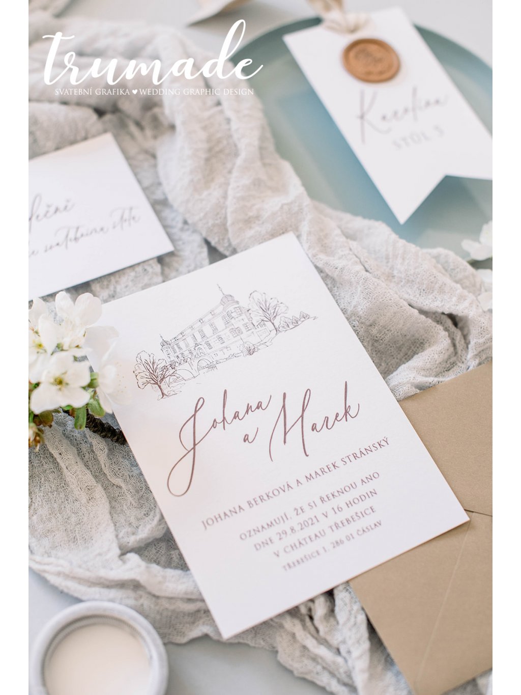 Kolekce „Chateau“ je vhodná pro všechny snílky a něžné duše. Kresbu svatebního místa (kostela, kapličky, zámku apod.) můžeme použít nejen na oznámení, ale i na další tiskoviny.
