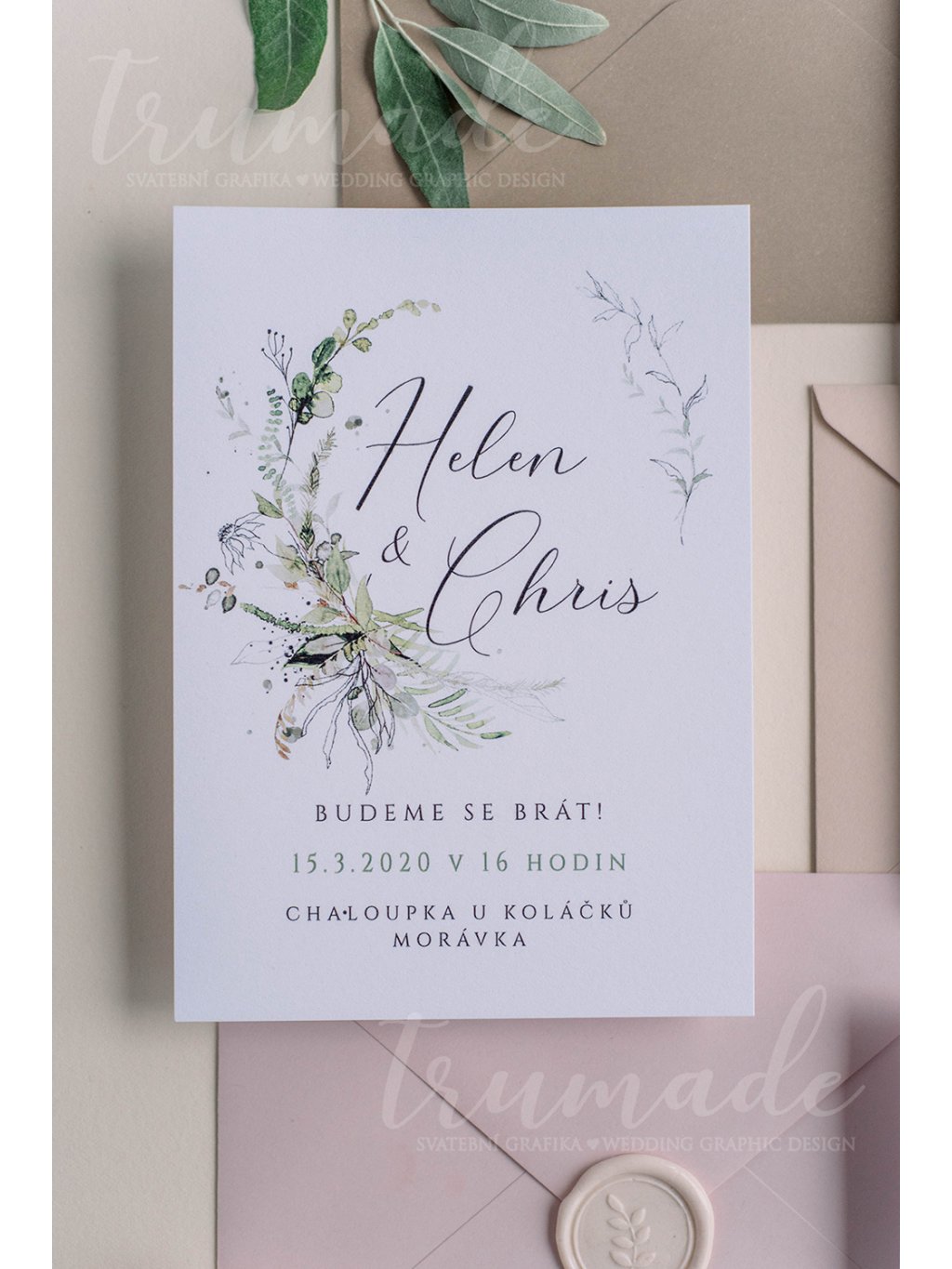 Decentní svatební oznámení s jemnou a zároveň výraznou kresbou zelených větviček na přírodním italském papíře.